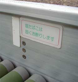 ******** 「すべり台」 長〜いローラー式すべり台の終点です。 すべり終えて、寝たままの一服禁止。 (撮影地:静岡県磐田郡) ******** この手の注意はベッドサイドでよく見かけるのですが… たしかにここで寝たら背中のツボが刺激されて 気持ち良さそうです(笑)。(管理人・談)
